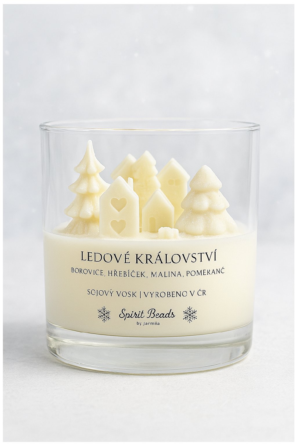 Objev kouzlo zimní pohádkové krajiny ukryté v jedinečné ručně vyráběné svíčce Ledové království. Každý kus je originální – uvnitř vysoké sklenice se nachází malá zasněžená vesnička tvořená z jemně dobarveného sójového vosku: domečky se srdíčky, zasněžené stromky a drobné detaily, které vytvářejí neopakovatelnou atmosféru.