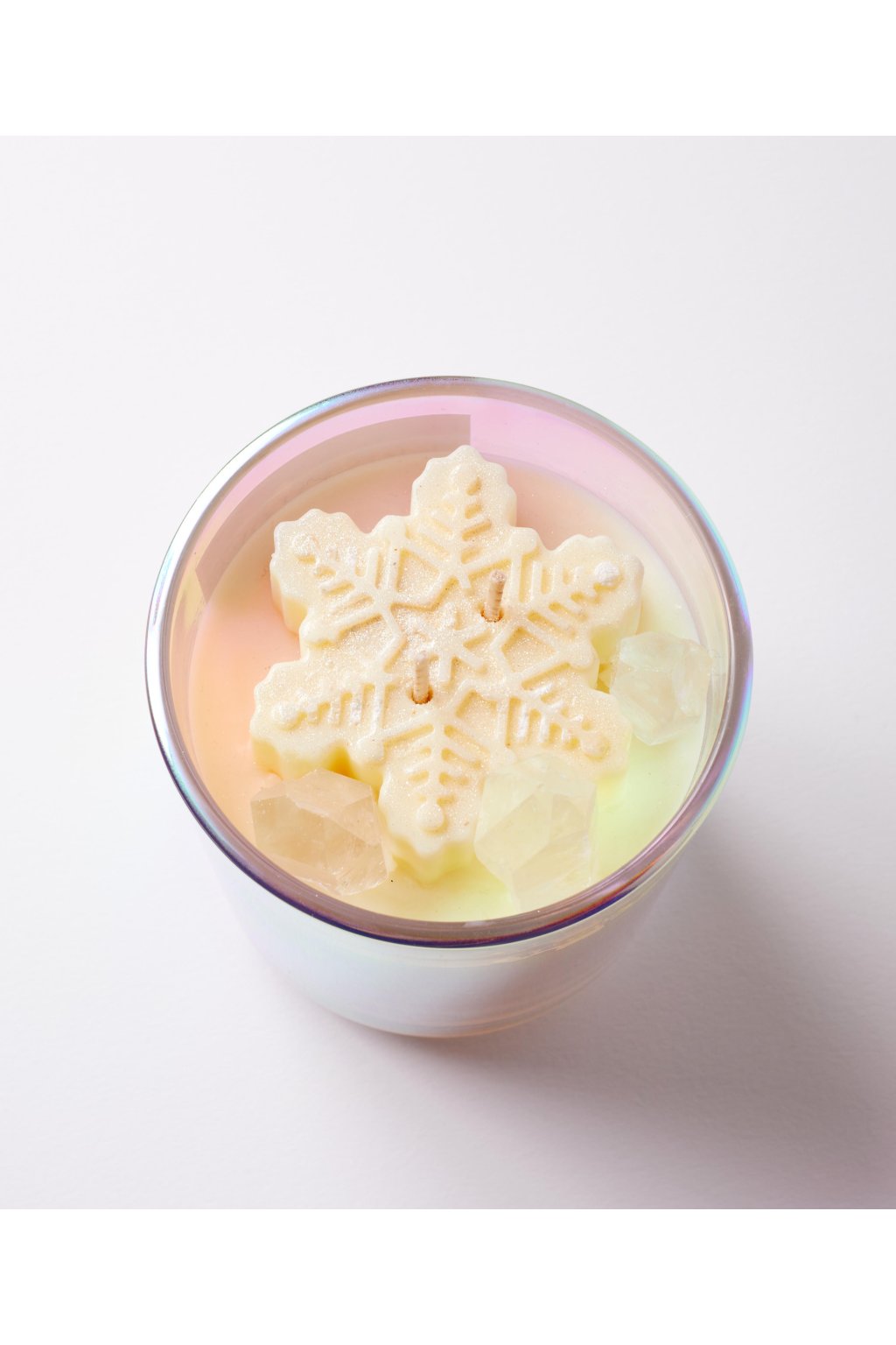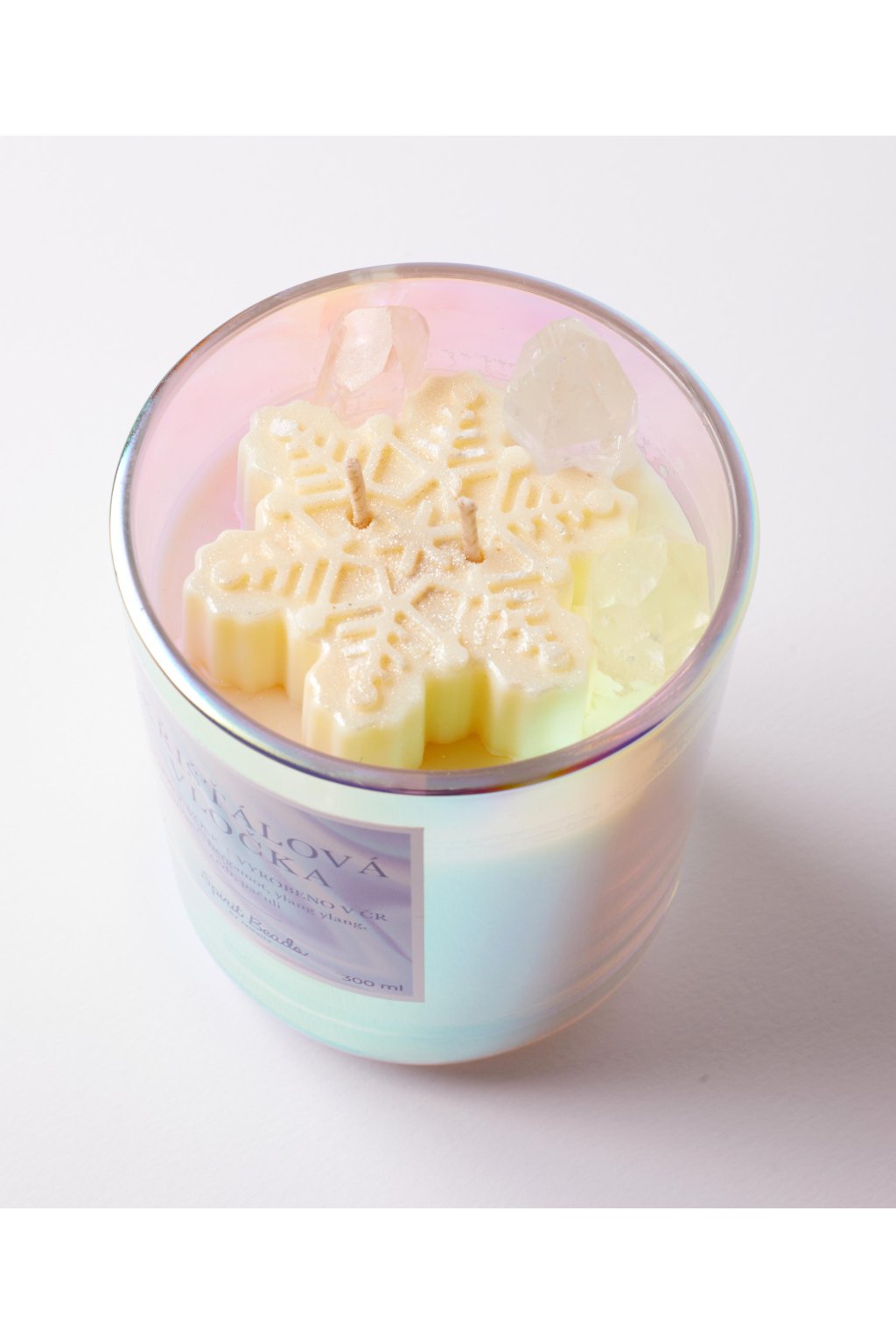 Svíčka je ukryta v nádherné duhové, lesklé sklenici, která se po vyhoření snadno promění v elegantní dekoraci pro váš interiér. Na vrcholu svíčky najdete velkou voskovou vločku s třpytivými stříbrnými detaily a kolem ní jsou ručně vytvořené křišťálové špice, které dodají svíčce jedinečný vzhled.