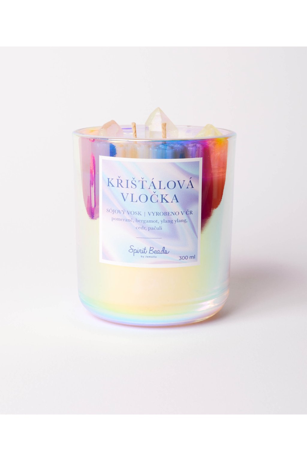 Luxusní svíčka ze 100% přírodního sójového vosku, ručně vyrobená v ČR. Opojná kombinace esenciálních olejů (pomeranč, bergamot, ilang ilang, cedr, pačuli) provoní váš domov a navodí příjemnou atmosféru. Svíčka je umístěna v krásné duhové sklenici, která po vyhoření poslouží jako stylová dekorace. Na vrchu dominuje vosková vločka se stříbrnými třpytkami, obklopená křišťálovými špicemi.